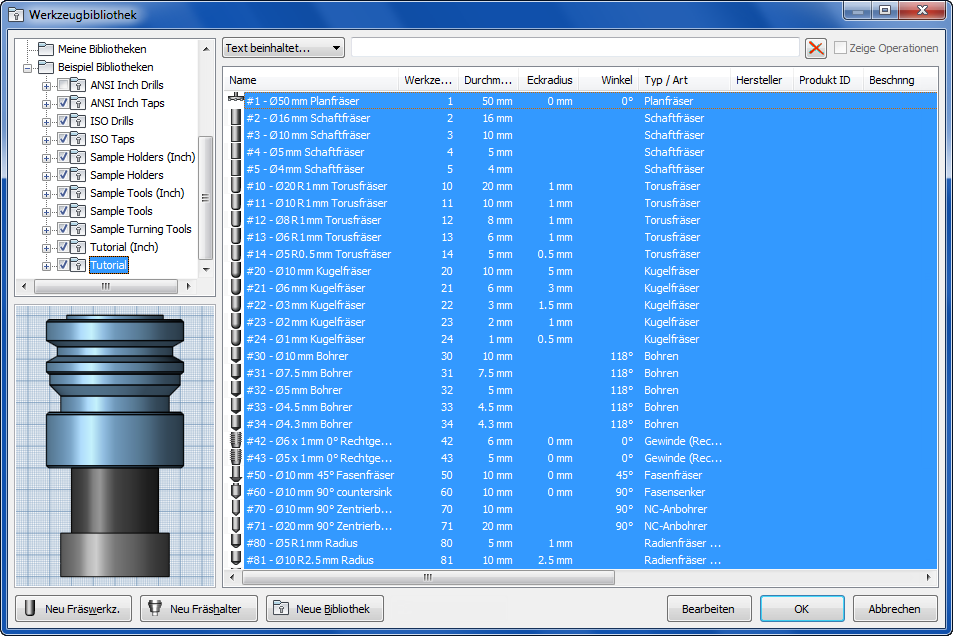 - Klicken Sie im Dialogfeld Werkzeugbibliothek mit der rechten Maustaste, und wählen Sie Einfügen, oder drücken Sie Strg+V. Die Werkzeuge aus der Zwischenablage werden zur aktuellen Bibliothek hinzugefügt, ersetzen jedoch keine vorhandenen Werkzeuge. Wenn Sie Werkzeuge ersetzen möchten, müssen Sie diese zuerst löschen.