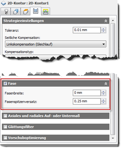 Definieren und wählen Sie zunächst ein Fasenfräserwerkzeug. Diese Aktion aktiviert automatisch die Option Fase in der Parametergruppe 2D-Kontur auf der Registerkarte Strategieeinstellungen.
