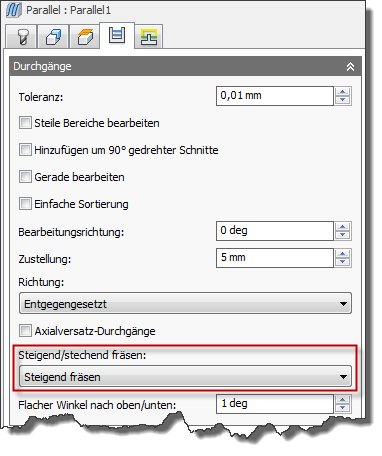 Bei der Verwendung von steigendem oder stechendem Fräsen können Sie zusätzlich den Steigend/Stechend Neigungswinkel einstellen.