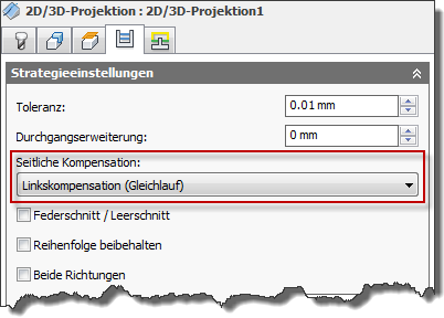 2D/3D-Projektion ermöglicht eine seitliche Kompensation des Werkzeugs links und rechts von den gewählten Konturen.