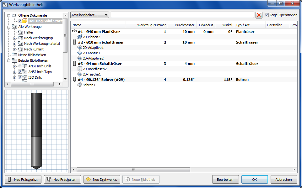 Bei der Arbeit an einem Job ist es üblich, verschiedene Werkzeuge zu definieren und zu testen, um das gewünschte Ergebnis für die ausgewählte Operation zu erzielen. Nach Abschluss aller Operationen für die Bearbeitung eines Bauteils können Sie auf zahlreiche Werkzeuge in der Werkzeugbibliothek für das aktuelle Dokument zugreifen, die keiner Operation zugeordnet sind (nicht verwendete Werkzeuge).