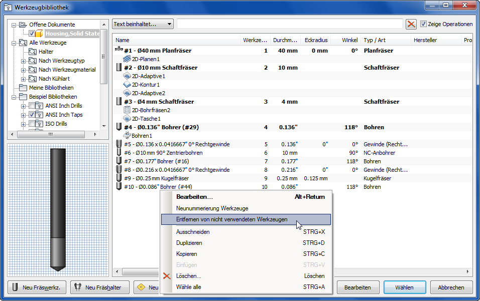 Inventor HSM erlaubt das einfache Entfernen aller nicht verwendeten Werkzeuge, indem Sie mit der rechten Maustaste auf die Bibliothek oder das Werkzeug klicken und im Kontextmenü Entfernen von nicht verwendeten Werkzeugen auswählen.