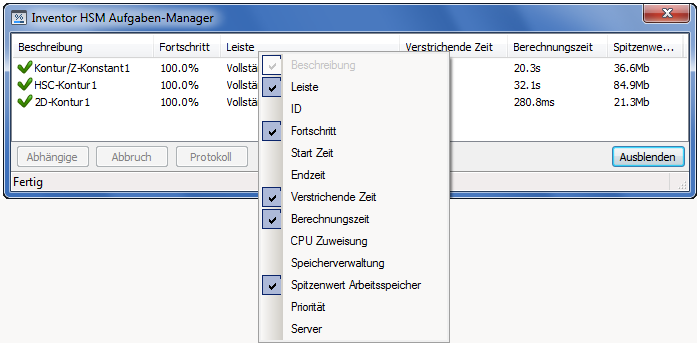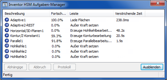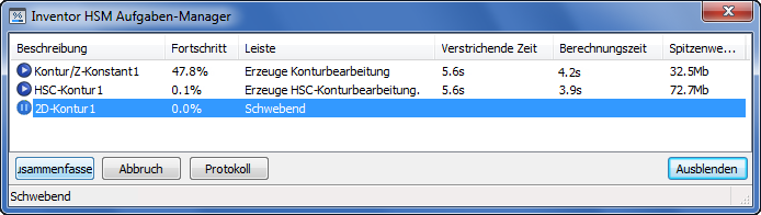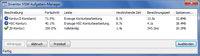 Vorgabemäßig blockiert der Aufgaben-Manager die restliche Benutzeroberfläche. Dadurch kann der Kernel alle CPU-Ressourcen nutzen, da der Rest von Inventor HSM und Inventor inaktiv ist. Wenn Sie jedoch nicht warten möchten, bis die Berechnung abgeschlossen ist, klicken Sie einfach in dem Dialogfeld auf die Schaltfläche Ausblenden. Auf diese Weise können Sie weiterarbeiten, während der Werkzeugweg im Hintergrund weiter berechnet wird.