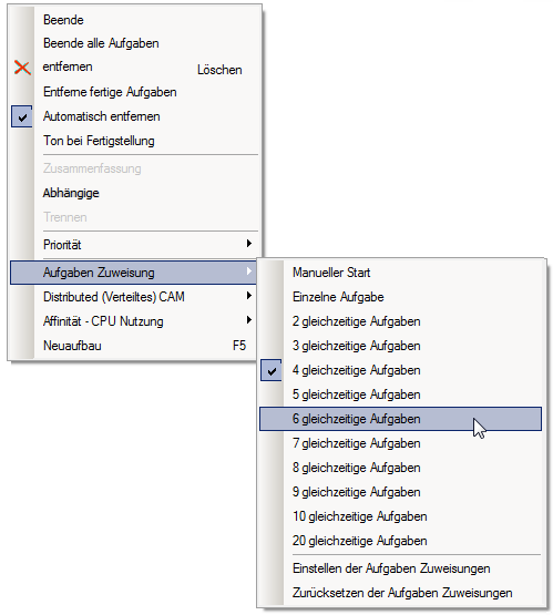 Wenn es mehrere Neuberechnungsaufgaben gibt, startet Inventor HSM automatisch eine Reihe von Jobs gleichzeitig. Diese Jobs entsprechen der Anzahl der Prozessorkerne im System, da sich so normalerweise die beste Leistung erzielen lässt. Wenn Sie dieses Verhalten ändern möchten, klicken Sie mit der rechten Maustaste auf die Aufgabenliste und wählen eine andere Einstellung für Aufgabenzuweisung.