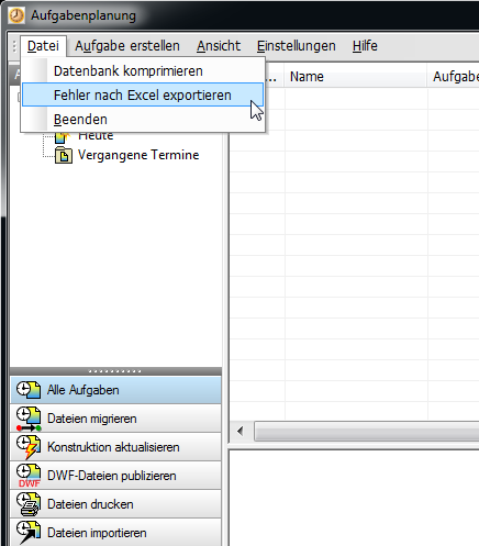 Fehler nach Excel exportieren ist im Menü Datei der Aufgabenplanung sowie im Kontextmenü für eine ausgewählte Aufgabe verfügbar.