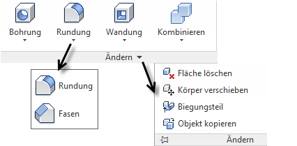 Einige Befehle wurden aus der Hauptgruppe in eine Untergruppe bzw. in eine Dropdown-Liste innerhalb der Gruppe verschoben. Beispielsweise wurde die Gruppe Ändern der Registerkarte 3D-Modell von Bauteildateien (.ipt) dahingehend optimiert, dass nun vorgabemäßig weniger Befehle angezeigt werden. Die anderen Änderungsbefehle wurden in einem Dropdown-Menü zusammengefasst oder in die erweiterte Gruppe Ändern verschoben: