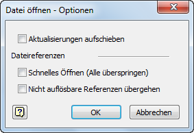 Mit der neuen Option Schnelles Öffnen im Dialogfeld Datei öffnen - Optionen einer Zeichnung kann eine Zeichnung schnell geöffnet werden. Wenn Sie die Option Schnelles Öffnen aktivieren, wird nicht versucht, von der Zeichnung referenzierte Dateien zu finden oder aufzulösen. Nach dem Öffnen verhält sich die Zeichnung so, als wäre sie ohne vorhandene Dateireferenzen geöffnet worden. Sie können die Zeichnung bearbeiten und Änderungen speichern.