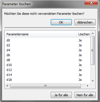 Unten im Dialogfeld Parameter können Sie mit der Option Nicht verwendete bereinigen eine Liste aller nicht verwendeten Parameter in einem separaten Fenster anzeigen. Sie können sie dort in einem Schritt löschen. Klicken Sie auf Ja für alle, um alle nicht verwendeten Parameter im Dokument zu löschen, oder auf Nein für alle, um die nicht verwendeten Parameter im aktuellen Dokument beizubehalten.