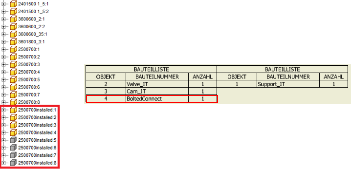 Wenn das Kontrollkästchen Menge anpassen aktiviert ist, wird die Option Menge in einer Bauteilliste entsprechend der Sichtbarkeit der Elemente in der Konstruktionsansicht angepasst. Nur diese sichtbaren Bauteile werden bei den Spalten Menge und Objektmenge in einer Bauteilliste berücksichtigt.