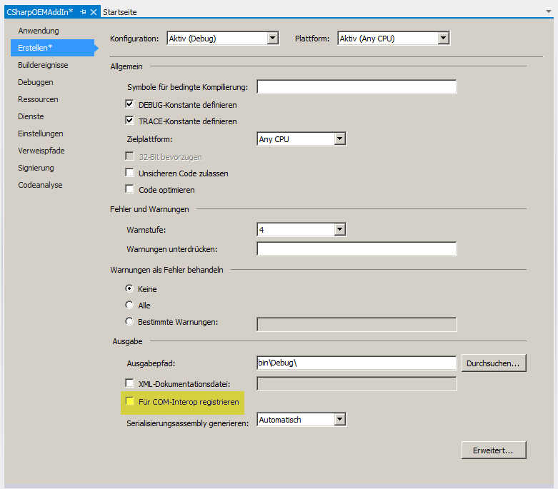 - Deaktivieren Sie im Dialogfeld Anwendungseigenschaften auf der Registerkarte Build im Bereich Ausgabe das Kontrollkästchen Für COM-Interop. registrieren.