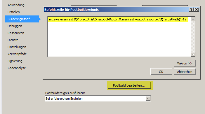 - Fügen Sie einen Post-Build-Prozess hinzu, um dieses Manifest in die .dll zu integrieren. Der Post-Build-Prozess ruft mt.exe auf, ein Microsoft-Dienstprogramm, das das Manifest in die DLL-Datei des Zusatzmoduls einbettet. Klicken Sie im Dialogfeld Anwendungseigenschaften auf der Registerkarte Build-Ereignisse auf Post-build bearbeiten…