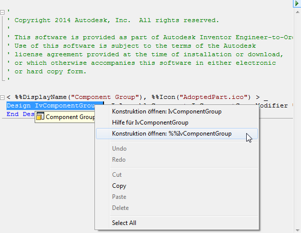 Um ein solches zu öffnen oder um das Hilfethema zum Design aufzurufen, klicken Sie mit der rechten Maustaste auf den Namen des betreffenden Designs und dann auf Design öffnen:[design].