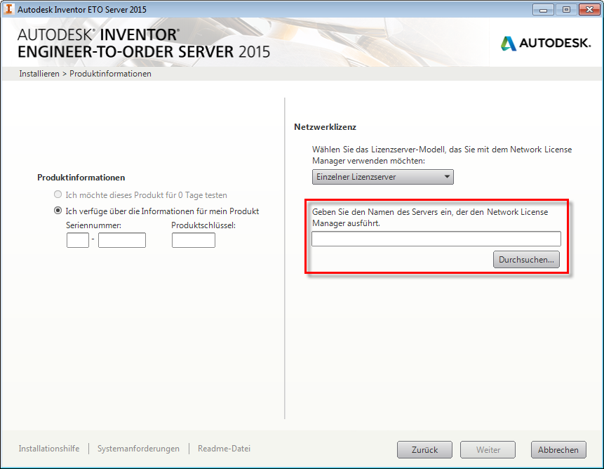 - Geben Sie auf der Seite Produktinformationen die Lizenzinformationen ein. Geben Sie den Namen des Servers ein, den Sie unter Netzwerklizenz ausgewählt haben.