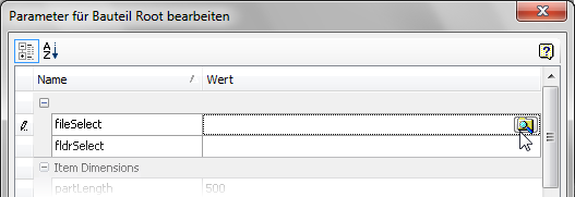 Wenn Sie einen SelectFile-Editor angeben, wird im zugehörigen Feld Wert im Bauteil-Editor ein Symbol zum Durchsuchen angezeigt.