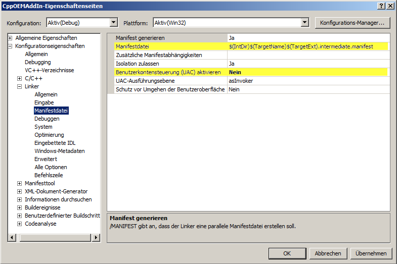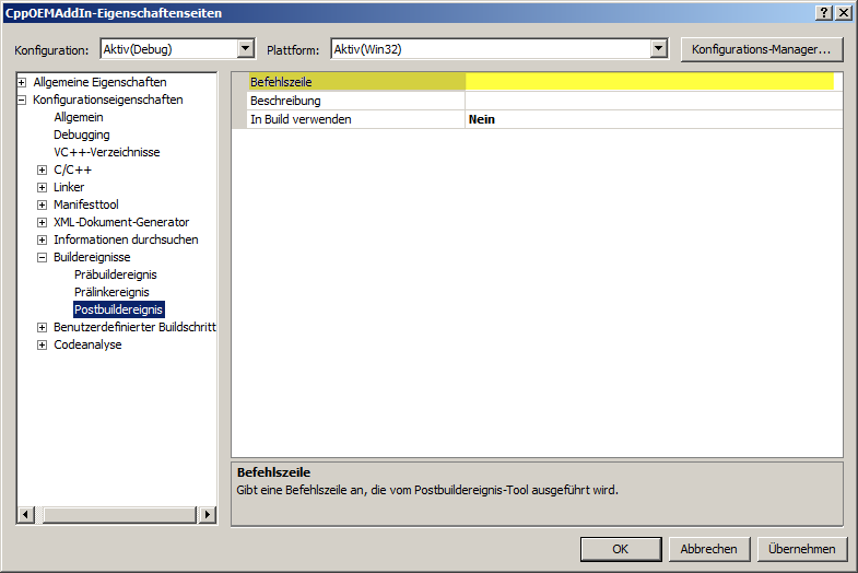Das Namensattribut des clrClass-Elements besteht aus zwei Teilen, die durch Punkte voneinander getrennt sind. Der erste Teil ist der Name Ihres Projekts, in diesem Beispiel CppOEMAddIn. Der zweite Teil ist der Name der Klasse, die die ApplicationAddInServer-Schnittstelle implementiert, in diesem Beispiel CppOEMAddInAddInServer: