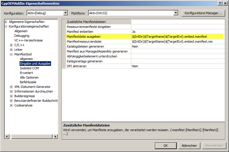 Um sicherzustellen, dass das Manifest korrekt eingebettet ist, ziehen Sie die Zusatzmodul-DLL in Visual Studio. Der Ordner "RT_MANIFEST" wird angezeigt, wie in der folgenden Abbildung dargestellt. Doppelklicken Sie auf das Symbol 2, um ein Fenster mit den tatsächlichen Manifestdaten anzuzeigen.