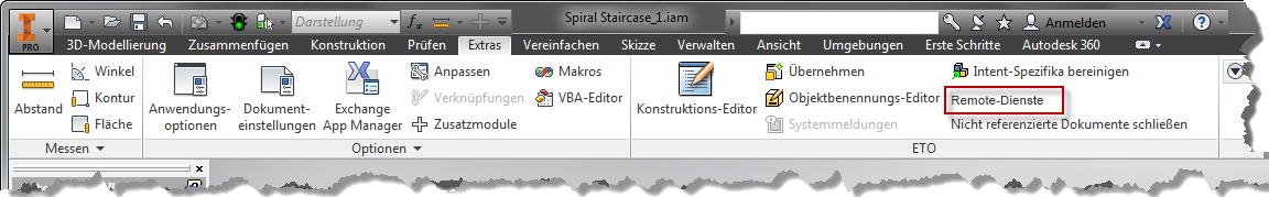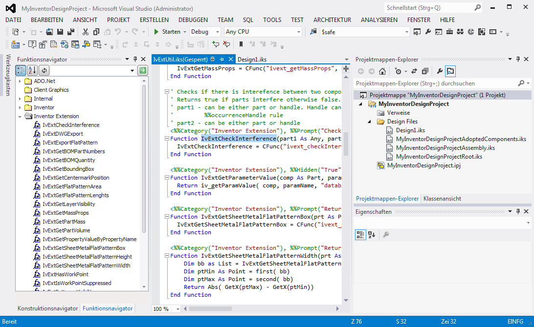 Im Design-Editor vorhandene Werkzeuge und Steuerelemente (z. B. Design- und Funktionsnavigator) und der CAD-Host (wie die Intent-Modell-Baumstruktur) sind in der Visual Studio-Umgebung verfügbar. Diese Steuerelemente sind in Visual Studio und der Host-IDE im Wesentlichen gleich. Aktivieren Sie diese Werkzeuge im Menü Ansicht -> Autodesk ETO Studio Windows.