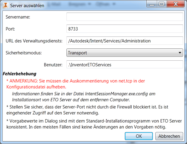 Anmerkung: Aus Sicherheitsgründen ist der net.tcp-Endpunkt in der Konfigurationsdatei der Serveranwendung vorgabemäßig auskommentiert. Um net.tcp zu aktivieren, bearbeiten Sie auf dem angegebenen Anwendungsserver IntentSessionManager.exe.config. Diese Datei befindet sich im Verzeichnis bin der Serverinstallation.