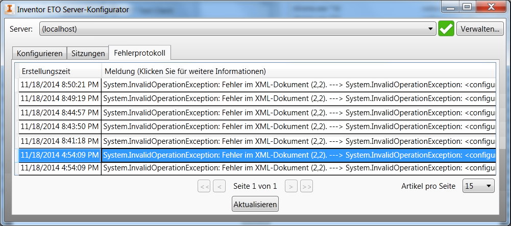 Die Registerkarte Fehlerprotokoll zeigt das Fehlerprotokoll der Intent Services an. Zur Aktualisierung der Daten klicken Sie auf Aktualisieren. Fehler werden in absteigender Reihenfolge sortiert. Klicken Sie auf einen Fehler, um ihn zu erweitern.