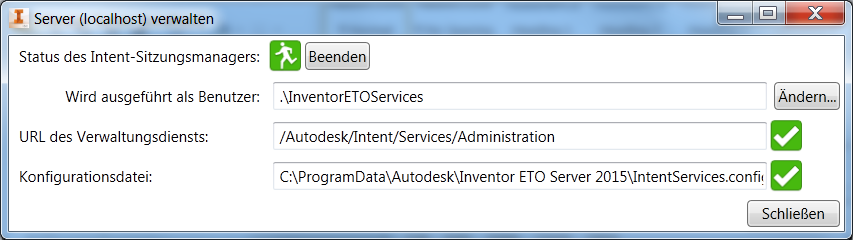 - Status des Intent-Sitzungsmanagers Starten und Beenden des Windows Server-Sitzungs-Manager-Diensts. Führen Sie diesen Dienst aus, um Serverfunktionen verfügbar zu machen. Der aktuelle Status wird angezeigt, und Sie können den Dienst manuell starten oder beenden. Dieser Dienst wird in der Liste der Windows-Dienste als Intent Session Manager angezeigt.