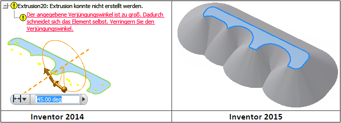 Die Stabilität bei der Erstellung von Wandungen und verjüngten Extrusionen wurde verbessert. Nun werden noch komplexere Geometrien unterstützt. In Inventor 2014 können Sie beispielsweise das folgende Profil mit korrekter tangentialer Abhängigkeit nur mit einem Verjüngungswinkel von bis zu 27 Grad extrudieren. In Inventor 2015 kann der Verjüngungswinkel einen beliebigen Wert zwischen 0 und 90 Grad annehmen.