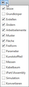 Gruppen mit weniger häufig verwendeten Befehlen oder Befehle mit doppeltem Zugriffspunk werden ausgeblendet, um den Platz im Arbeitsbereich zu optimieren. Sie haben mehr Platz zum Anzeigen von und Arbeiten mit Modellen. Beispielsweise sind auf der Registerkarte 3D-Modell die Gruppen Grundkörper, Parameter, Messen, Kunststoffteil, Kabelbaum, iPart/iAssembly, Simulation und Konvertieren jetzt vorgabemäßig ausgeblendet.