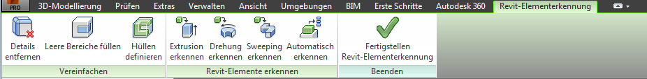 Verwenden Sie in der Umgebung Revit-Elemente erkennen die Befehle der Gruppe Vereinfachen zur Reduzierung der Modellkomplexität. Zur Darstellung Ihres Modells mit Elementen, die von Revit erkannt werden, verwenden Sie die Erkennungsbefehle der Gruppe Revit-Elemente.