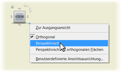 Vorgabemäßig wird zum Erstellen von Zeichnungsansichten die parallele Projektion verwendet. Wenn Sie die perspektivische Projektion verwenden möchten, klicken Sie beim Erstellen einer Erstansicht oder beim Bearbeiten einer Erstansicht oder einer unabhängigen parallelen Ansicht mit der rechten Maustaste auf den Ansichtswürfel und wählen Perspektive.