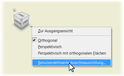 Klicken Sie mit der rechten Maustaste auf den ViewCube, und wählen Sie Benutzerdefinierte Ansichtsausrichtung, um die benutzerdefinierte Ansichtsumgebung aufzurufen. Geben Sie dann die Ausrichtung der benutzerdefinierten Ansicht an.