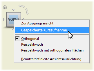 Bei Zeichnungsansichten, die auf einer Präsentationsansicht des Modells basieren, können Sie auf in der Präsentationsdatei (.ipn) gespeicherte Kameraeinstellungen zugreifen und diese anwenden. Klicken Sie mit der rechten Maustaste auf den Ansichtswürfel, und wählen Sie Gespeicherte Kurzaufnahme.