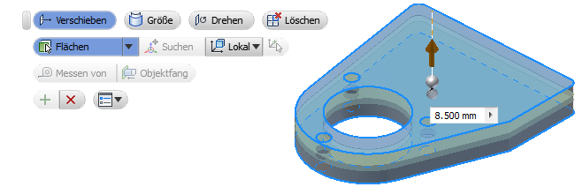 Direktbearbeitung ermöglicht die rasche Bearbeitung von Bauteilen. Sie können die Größe, Form und/oder Position von Modellelementen durch direkte Bearbeitung der Geometrie anpassen. Verwenden Sie die Direktbearbeitung für folgende Aufgaben: