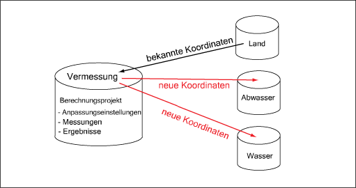 Im Vermessungsmodul werden Messungen, Berechnungseinstellungen und Ergebnisse in einem separaten Datenbankschema gespeichert. Festpunkte, die zur Ausgleichungsberechnung benötigt werden, können in einer beliebigen Fachschale auf dem Server gespeichert werden. Zudem können Sie die neuen Koordinaten auf jede beliebige Fachschale auf dem Server verteilen.