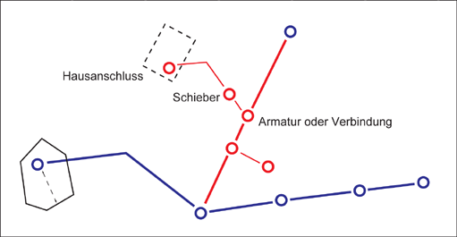 Sie können auf dem Hauptrohr eine Armatur an der Position digitalisieren, an der der Hausanschluss mit der Hauptrohr verbunden ist, und anschließend einen Schieber zur Leitung hinzufügen.