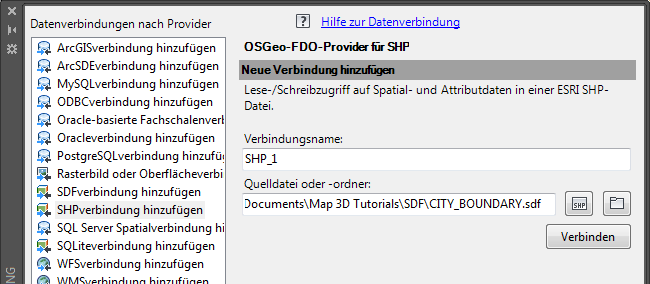 - Klicken Sie unter Quelldatei (rechts) auf die Durchsuchen-Schaltfläche, und navigieren Sie zur Beispieldatei City_Boundary.sdf. Klicken Sie auf Verbinden.