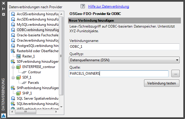 Geben Sie die neue Verbindung im Fenster Datenverbindung an. Fügen Sie der Karte keine bestimmten Objektklassen-Layer aus der ODBC-Quelle hinzu. Die Informationen stehen in AutoCAD Map 3D automatisch zur Verfügung, wenn Sie die Verbindung zur ODBC-Quelle herstellen.