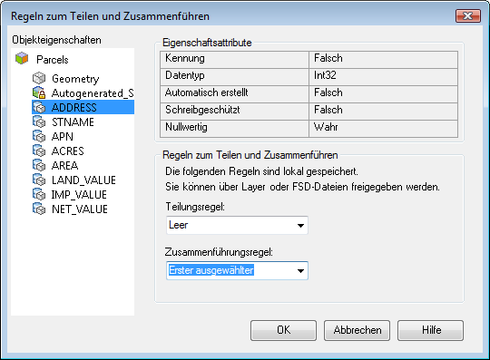 Mit Teilen können Sie Regeln für die Zuweisung von Eigenschaften festlegen, wenn Sie Geodatenobjekte teilen und zusammenführen. Für diese Regeln können Sie Ausdrücke verwenden.