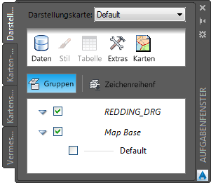 Über die Registerkarte in der Darstellungsverwaltung im Aufgabenfenster können Sie Stil und Anzeige der Elemente in einer Karte steuern. Die Layer in der Darstellungsverwaltung unterscheiden sich von AutoCAD-Layern, ermöglichen Ihnen jedoch ähnliche Aktionen. So können Sie beispielsweise Layer der Darstellungsverwaltung ein- bzw. ausblenden, auch wenn diese Layer Rasterbilder anstelle von Zeichnungsobjekten enthalten.