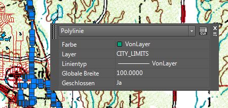 In dieser Übung ändern Sie die Breite der Polylinie, die die Stadtgrenzen darstellt. Die Stadtgrenzen sind dann in der Zeichnung deutlicher zu sehen. Anschließend schneiden Sie das Bild so zu, dass ein rechteckiger Ausschnitt angezeigt wird, der die Stadt umrahmt.