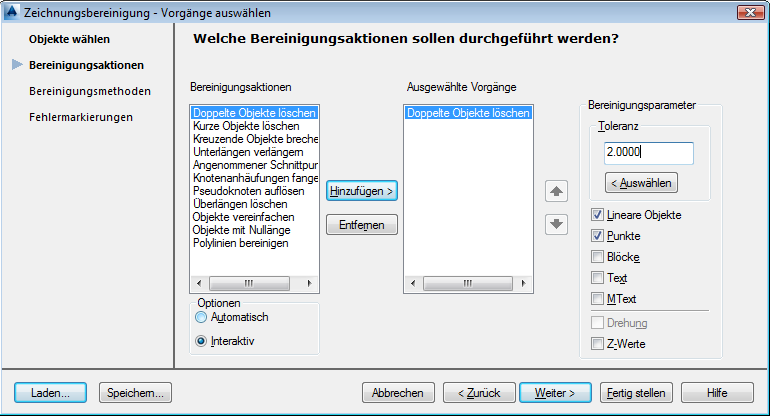 Die Zeichnungsbereinigung sucht die Fehler in der Zeichnung. Anschließend wird das Dialogfeld Fehler bei Zeichnungsbereinigung angezeigt. In diesem Dialogfeld werden die Fehler nach Fehlertyp sortiert. Doppelte Objekte löschen ist hervorgehoben.