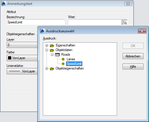 Falls Ihre Zeichnung Objektdaten enthält oder mit externen Daten verknüpft ist, können Sie Eigenschaften dieser Daten als Werte für die Anmerkung verwenden. Diese Eigenschaften sind dynamisch. Wenn Sie die Anmerkung Objekten zuordnen, wird bei jedem Objekt ein eigener Wert für diese Eigenschaft angezeigt.