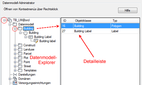 Datenmodelle enthalten Themen, Domänen, Objektklassen, Topologien und Verschnitte. Verwenden Sie den Datenmodell-Administrator, um die Datenstrukturen einer Fachschale zu untersuchen.