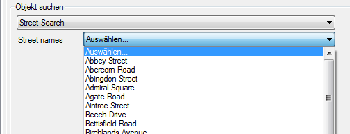 Im Gruppenfeld Objekt suchen können Sie einen Kartenmittelpunkt angeben, indem Sie ein bestimmtes Objekt auswählen. Die Suchen können mit dem Objektsuche-Administrator definiert werden. Für diese Suche wird ein hierarchischer Suchtyp mit einem Kombinationsfeld für Eingaben verwendet.