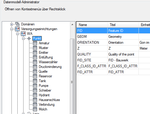 Versorgungsnetzwerk-Datenmodell: Darstellung der Wasserknoten-Objektklasse Punkt und deren Relationen zu den Objektklassen des Objekts im Datenmodell-Explorer.