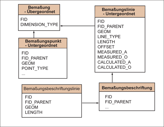 Es gibt spezielle Objektklassen zum Speichern von Bemaßungen in der Datenbank. Eine Bemaßung besteht aus mehreren verknüpften Objektklassen. Eine Bemaßungsobjektklasse (übergeordnete Attributobjektklasse) ist mit mehreren untergeordneten Objektklassen verknüpft, in denen die Geometriekomponenten wie Punkte (Symbole), Linien und Labels gespeichert sind.