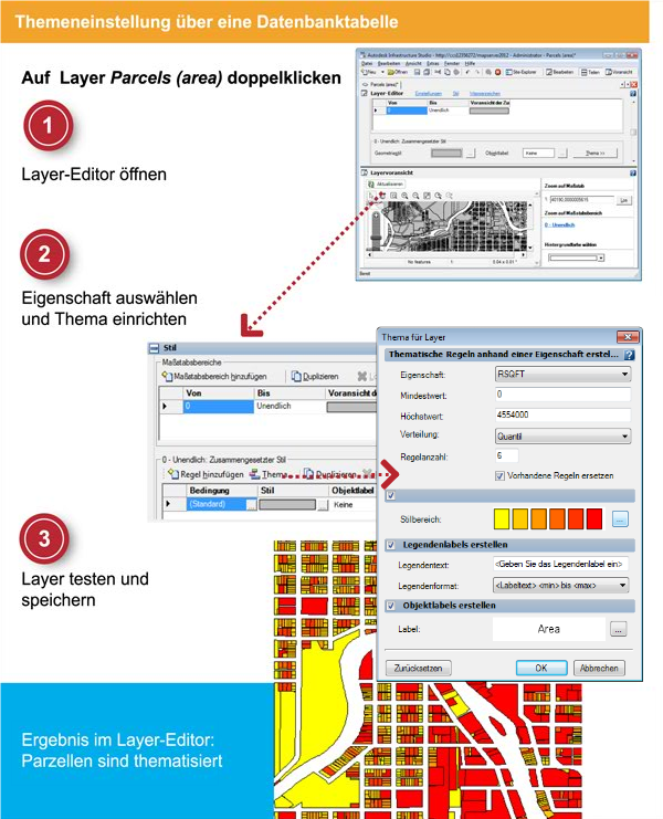 In dieser Übung thematisieren Sie die Parzellen in der Karte nach ihrer Fläche in Quadratfuß, indem Sie eine Spalte (Eigenschaft) aus einer Datenbanktabelle verwenden.