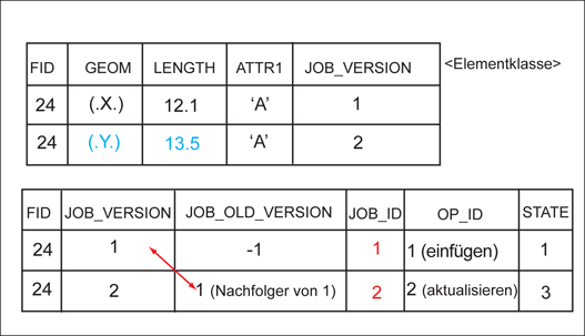 Wenn ein Benutzer ein Objekt innerhalb eines bestimmten Jobs (JOB_ID) bearbeitet, z. B. indem er das Objekt ändert, wird dieser Vorgang wie folgt in TB_JOB_VERSION registriert: