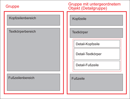 Berichtslayout, das eine Gruppe mit Kopfzeile, Hauptbereich und Fußzeile sowie eine Gruppe mit einer untergeordneten Gruppe zeigt