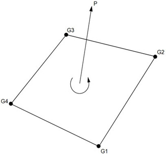 - In the case of a quadrilateral surface, the grid points G1, G2, G3, and G4 should form a consecutive sequence around the perimeter. The right-hand rule is applied to find the assumed direction of the pressure. Four concentrated loads are applied to the grid points in approximately the same manner as for a triangular surface. The following specific procedures are adopted to accommodate irregular and/or warped surfaces: