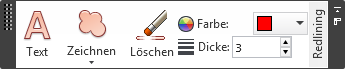 Über die Steuerelemente Dicke und Farbe können Sie Ihre Redlining-Einstellungen ändern. Diese Änderungen wirken sich nicht auf bereits gezeichnetes Redlining aus. Die Dicke bezieht sich ausschließlich auf Linien und nicht auf den Redlining-Text; dessen Größe und Stärke sind vorgegeben und können nicht geändert werden.
