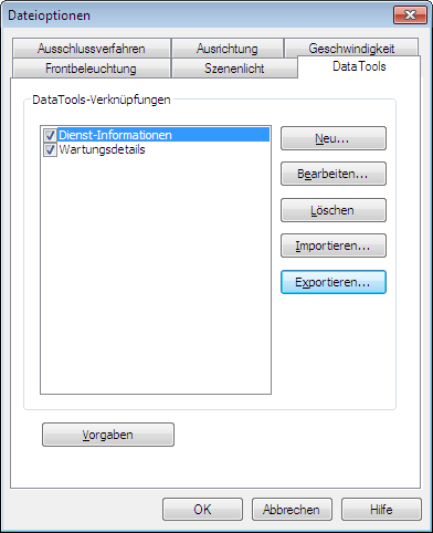 Klicken Sie im Dialogfeld Dateioptionen auf der Registerkarte DataTools im Bereich DataTools Verknüpfungen auf die gewünschte Verknüpfung, und wählen Sie Exportieren.